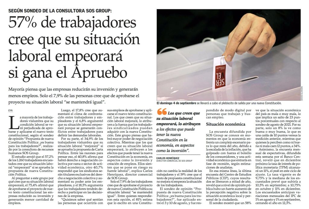 La mayoría de los trabajadores vislumbra que su condición laboral se verá perjudicada de aprobarse y aplicarse el nuevo texto constitucional, según el sondeo de opinión «Propuesta de nueva Constitución Política: ¿es buena para los trabajadores?», realizado por la consultora de recursos humanos SOS Group.