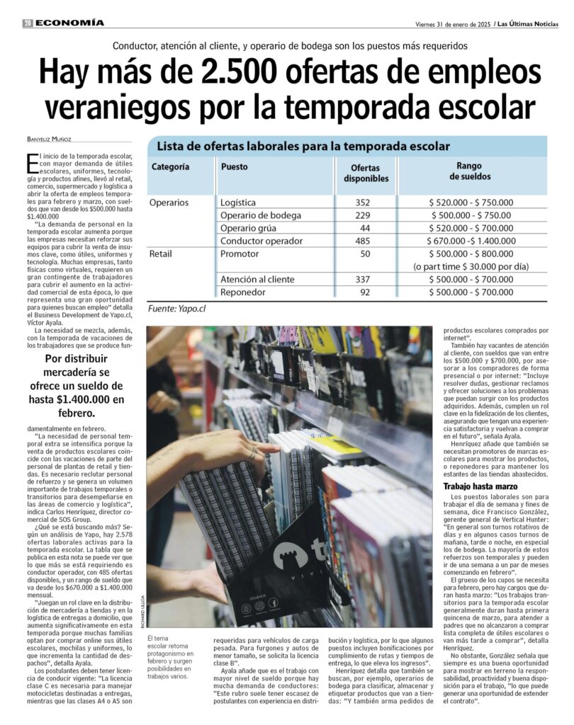«La demanda de personal en la temporada escolar aumenta porque las empresas necesitan reforzar sus equipos para cubrir la venta de insumos clave, como útiles, uniformes y tecnología. Muchas empresas, tanto físicas como virtuales, requieren un gran contingente de trabajadores para cubrir el aumento en la actividad comercial de esta época, lo que representa una gran oportunidad para quienes buscan empleo», detalla el Business Development de Yapo.cl, Víctor Ayala.
