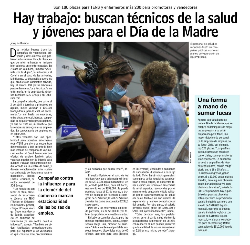 «Estas vacantes son una oportunidad para aquellas enfermeras (os) y TENS que ahora se encuentran desempleadas, y que durante la fase más intensa de campaña de vacunación contra el Covid tenían muchas ofertas de empleo. También estas vacantes pueden ser de interés para quienes trabajan con contrato de media jornada en un centro de salud, y deseen complementar este sueldo con un trabajo por hora en su horario disponible», explicó Carlos Henríquez, director comercial de SOS Group.