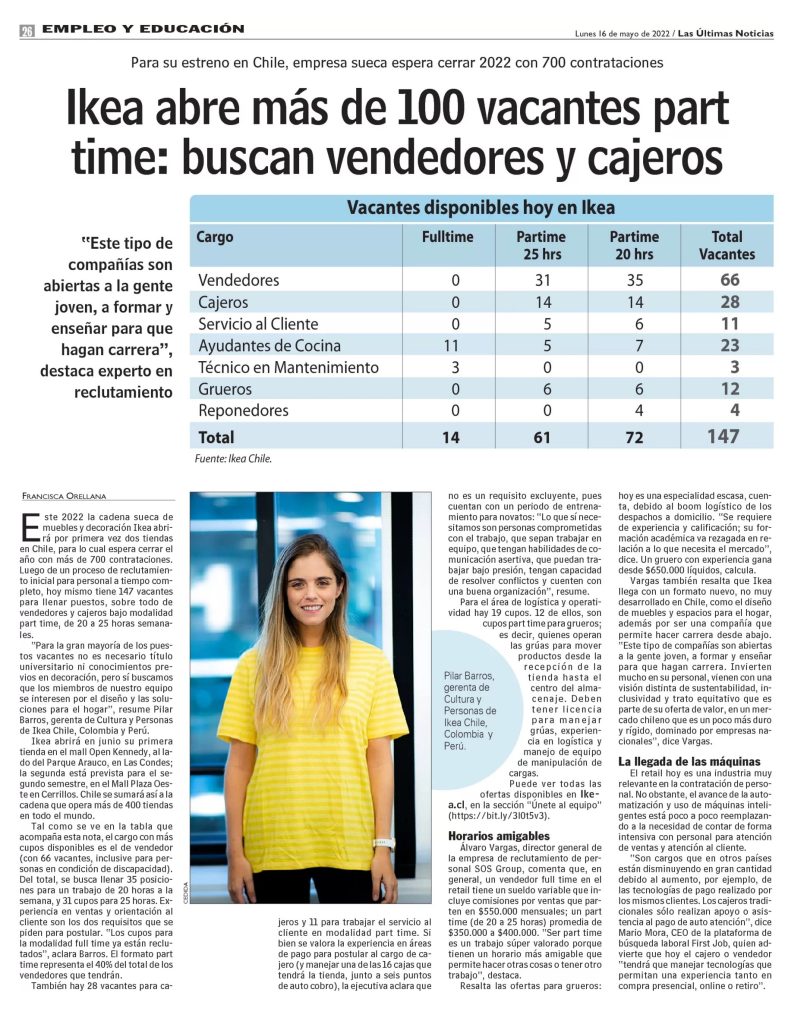 Este 2022 la cadena sueca de muebles y decoración Ikea abri¬rá por primera vez dos tiendas en Chile, para lo cual espera cerrar el año con más de 700 contrataciones. Luego de un proceso de reclutamiento inicial para personal a tiempo completo, hoy mismo tiene 147 vacantes para llenar puestos, sobre todo de vendedores y cajeros bajo modalidad pan time, de 20 a 25 horas semanales.