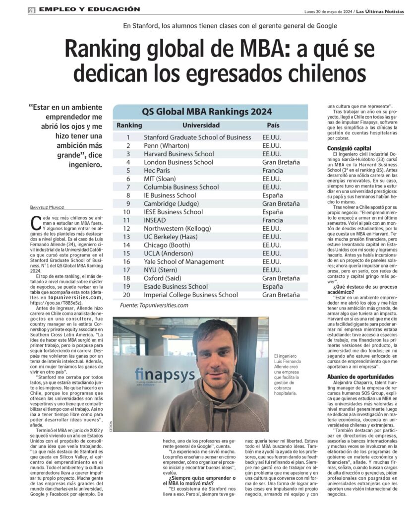 Cada vez más chilenos se animan a estudiar un MBA fuera. Y algunos logran entrar en algunos de los planteles más destacados a nivel global. Es el caso de Luis Fernando Allende (34), ingeniero civil industrial de la Universidad Católica, que cursó este programa en el Stanford Graduate School of Business, N.º 1 del QS Global MBA Ranking 2024.